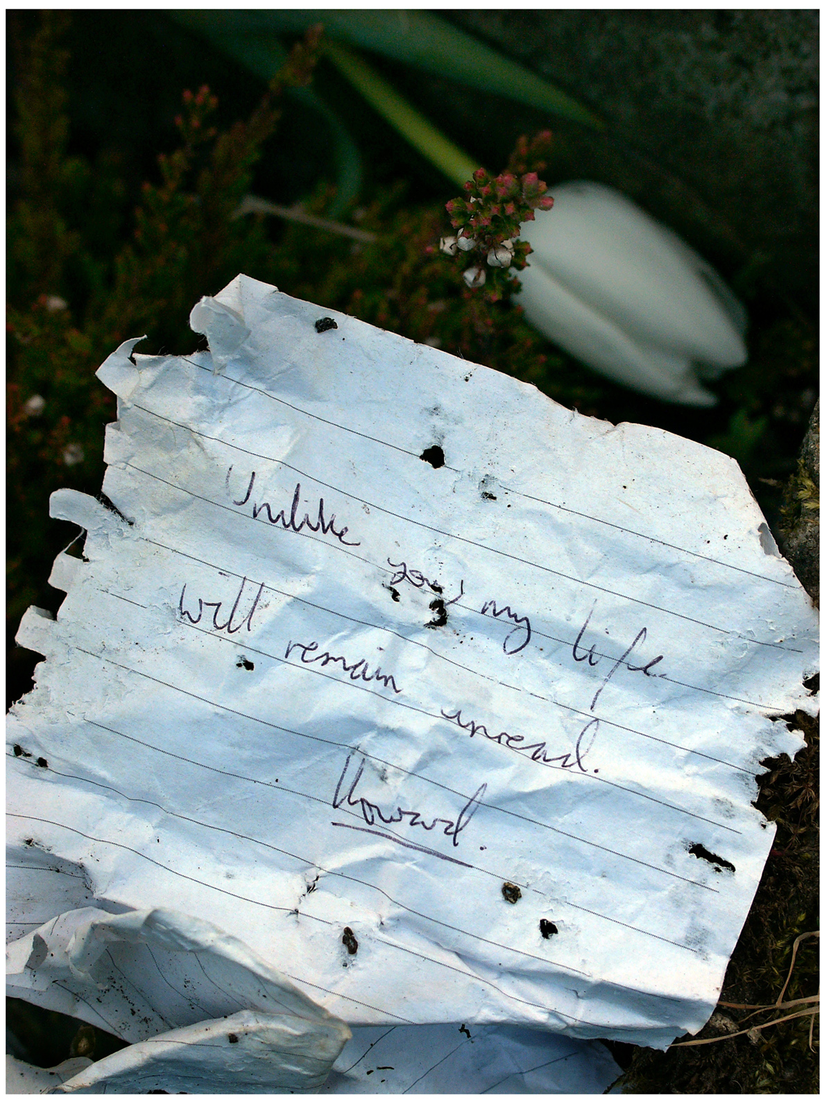 This is the first body of work Andrews has shot with a digital camera, and the hyper-clarity and intense colour of the medium reveals another moving dimension of this imagery. Beloved shows the way in which these symbolic monuments to the dead are all also undergoing beautiful decay. The photographs capture the rich textures of frost-damaged, acid-rain etched, soot-stained and lichen-covered granite and marble, the rich colours of the withered flowers, rotting wood, faded plastic, and matted fur of soft toys. There is a long tradition of the ‘memento mori’[1] in European art, art-works that remind us of the fragility and brevity of life through such symbolically loaded imagery as skulls, burning candles, delicate blossoms, ripe fruit and hour-glasses. This series of photographs about death and decay is a subtle, moving and fascinating contribution to this tradition.