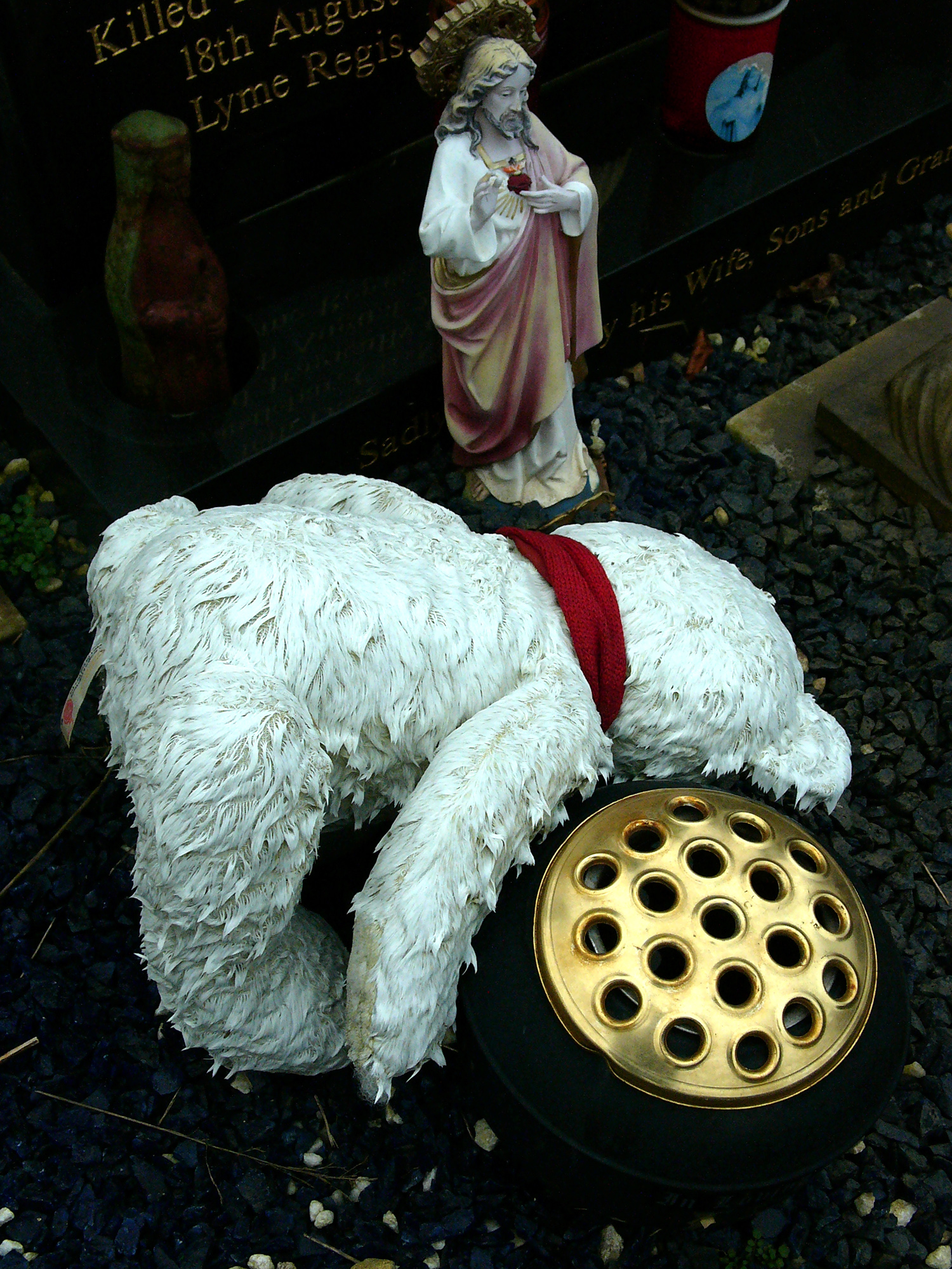 Appropriately, then, this latest series of photographs by Lancaster-based photographer Darren Andrews takes death as a central theme. Shot in cemeteries around Lancashire, Beloved consists of images of headstones, memorial statues, makeshift shrines and grave tokens left by grieving relatives. Thus, this is a series of photographs about contemporary rituals around death and the ways in which we commemorate the loss of friends, family members and lovers with sculpture, flowers, children’s toys, kitsch decorations, letters, poetry and religious text and imagery.