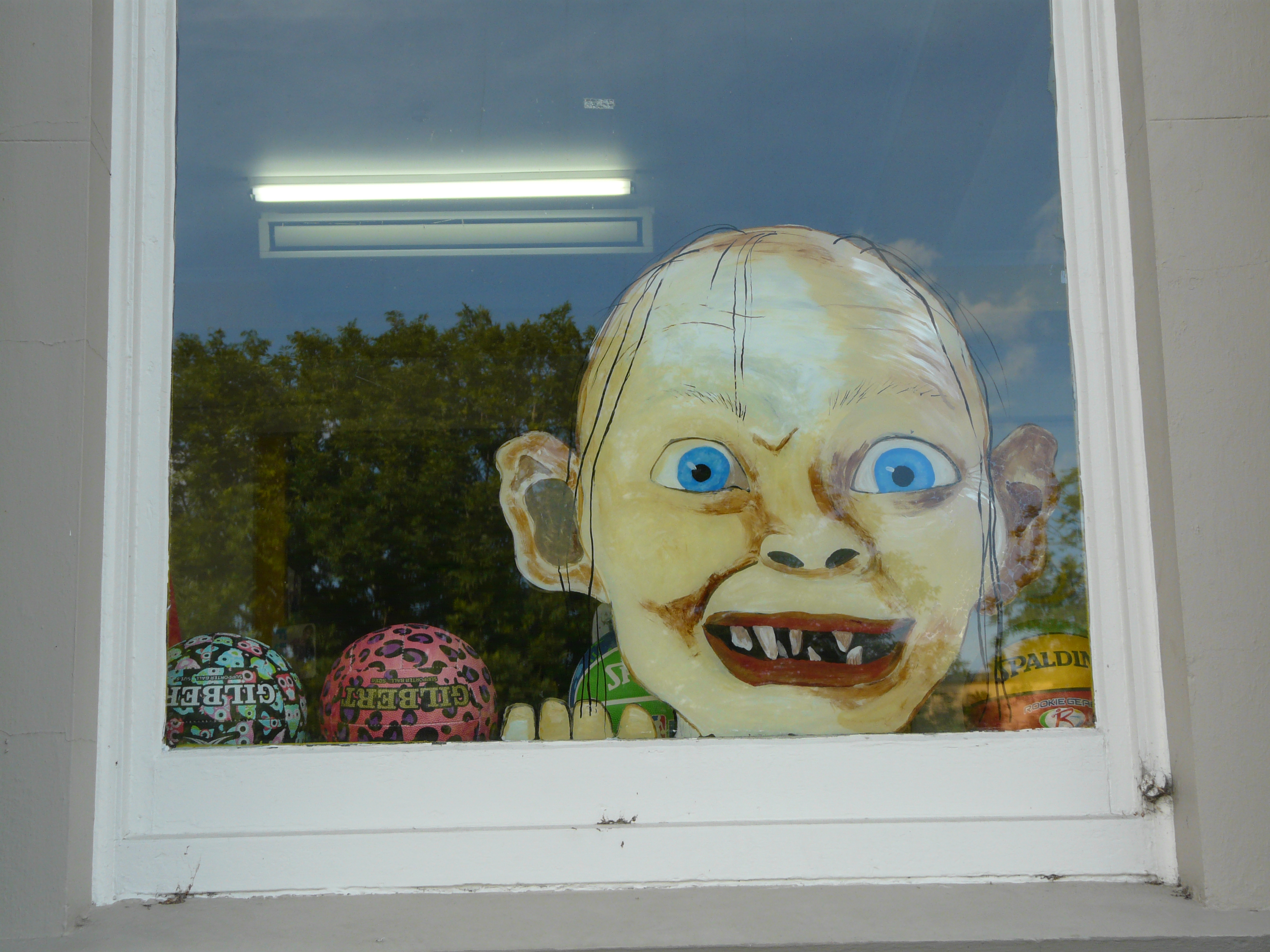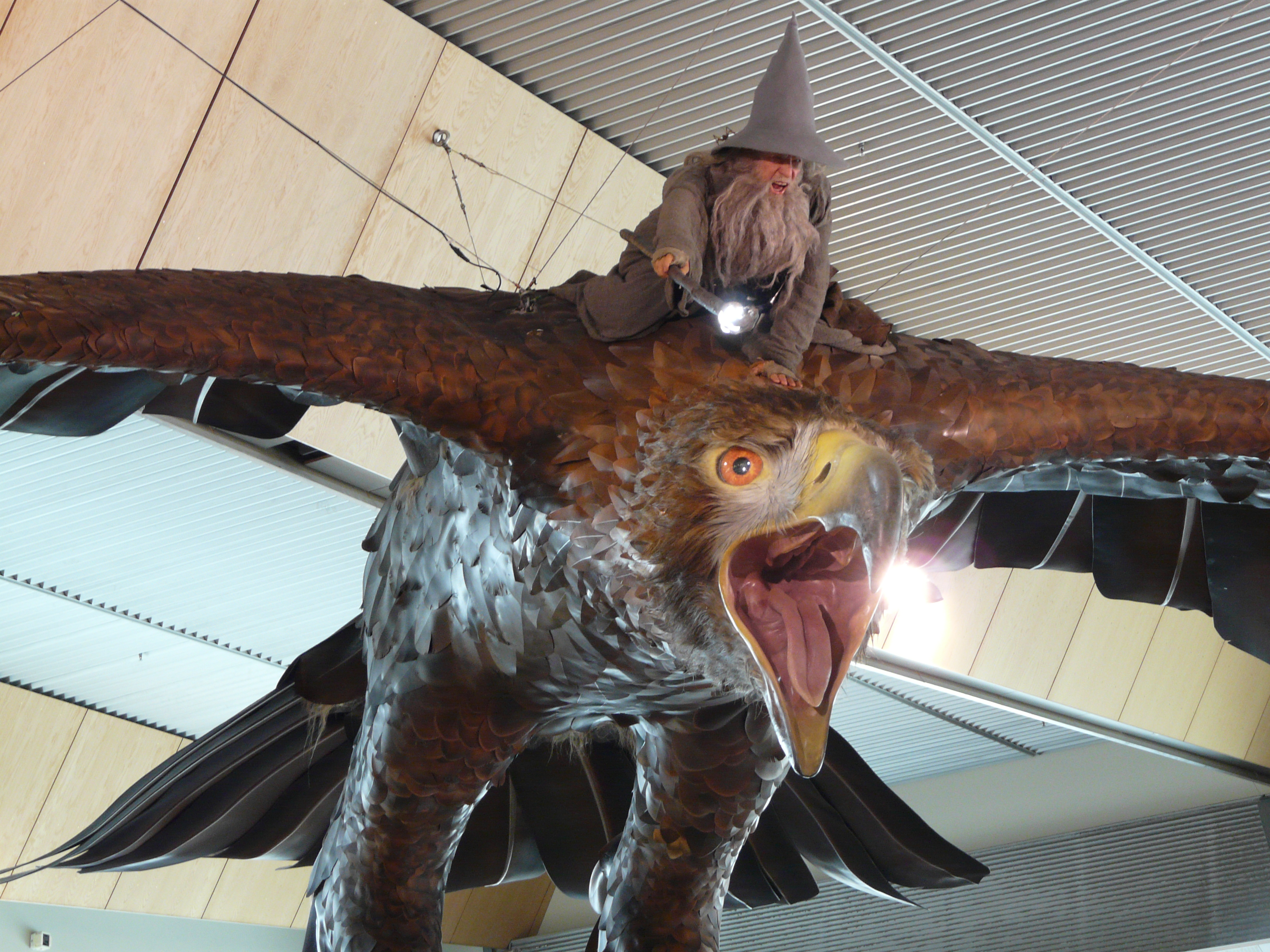 Visiting New Zealand six years later, it is clear that this similarity is a crucial promotional device. When you fly in to Wellington airport, for instance, one of the first things you see is the exterior of the terminal building, which is decked with a large banner proclaiming ‘Welcome to the Middle of Middle Earth’, while the interior of the terminal is dominated by impressive and beautifully detailed statues of Gollum catching fish underwater and Gandalf flying on the back of a giant eagle.