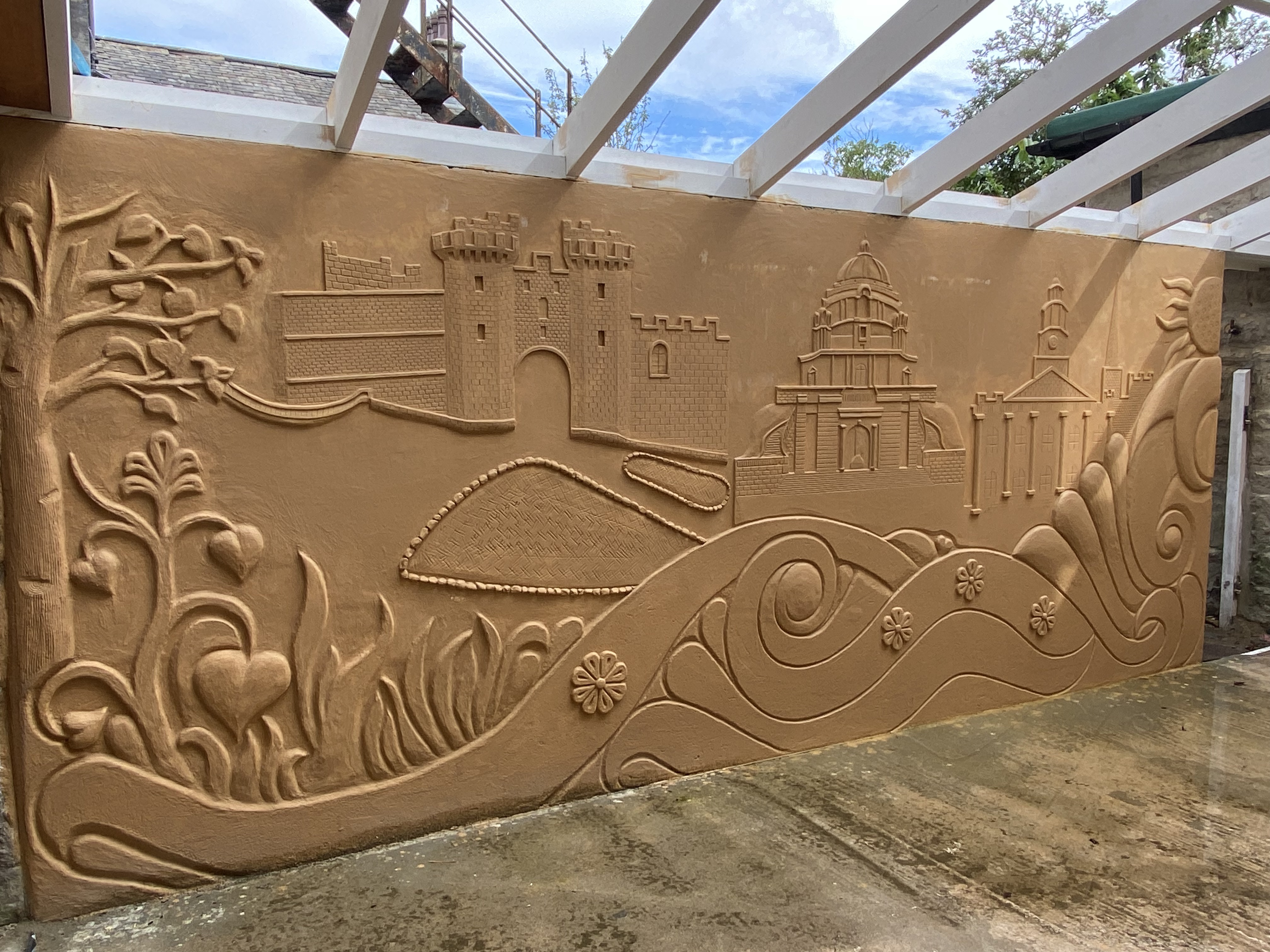 The relief in Lancaster is a beautiful piece of work, placing some key buildings from the city within a decorative frame of waves, flowers, and trees. Far from depicting Lancaster as a hostile environment, it portrays it as a sunny, welcoming space, and this warm tone is underlined by the heart-shaped leaves on the bush in the corner. That the artist can show it in this way is a touchingly positive sign that Lancaster isn’t necessarily experienced by asylum-seekers as the hostile environment that the government and the right in Britain would like it to be. It attests to the value of the support work that Global Link does (and, pleasingly, the instruction to demolish the wall was subsequently reversed).