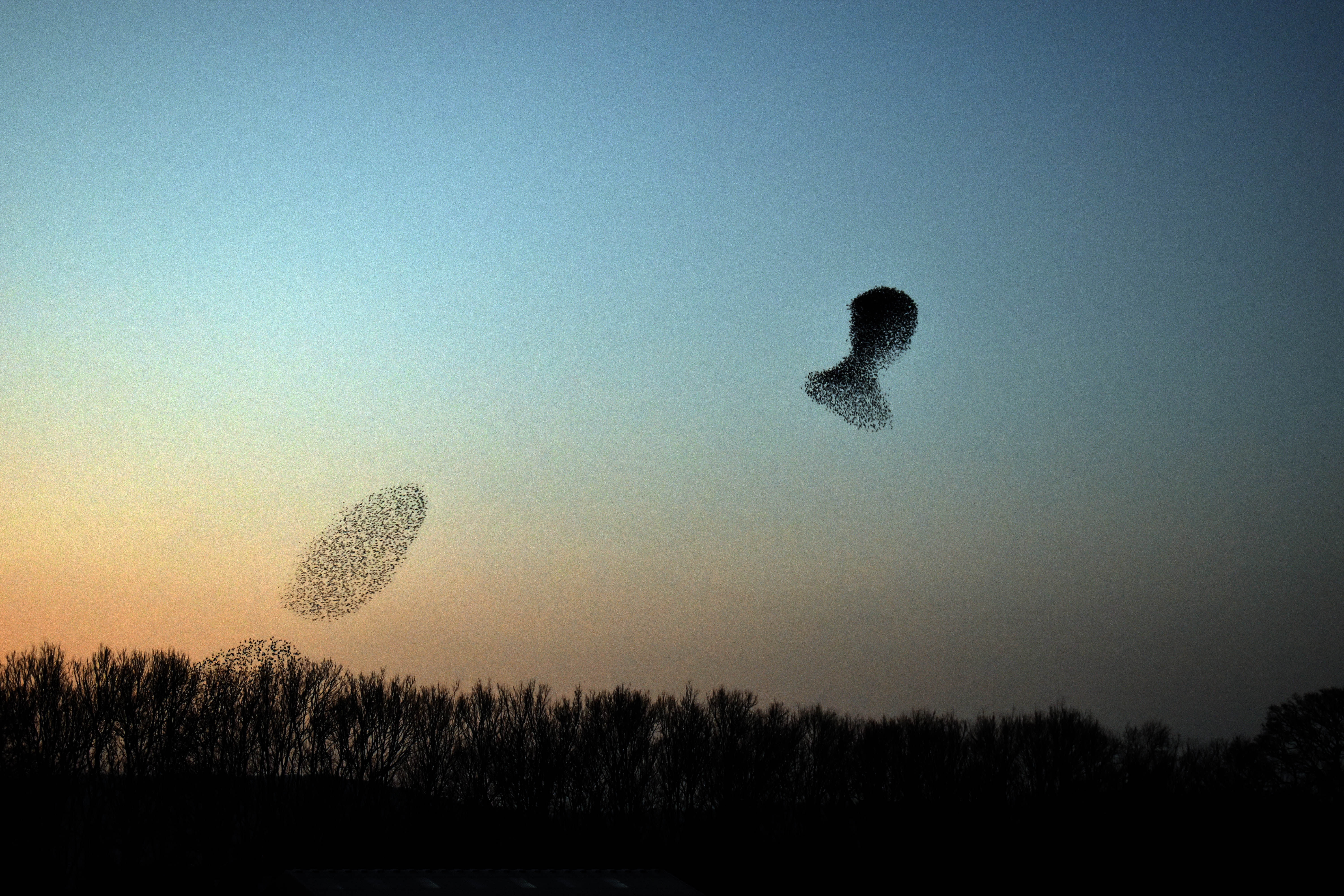 Darren Andrews’ photographs of murmurations are a perfect illustration of this phenomenon. In capturing frozen moments they reveal in these formations an extraordinarily complex, uncanny beauty that the unaided eye is incapable of registering, except as a fugitive, blurred impression. Like visual echoes of Rorschach inkblots, the abstract shapes of flocking starlings are an invitation to look for meaning, triggering different associations in different spectators. For me, there is something apocalyptic and threatening in the way that these morphing black forms shot in the fading light of dusk suggest devastating locust swarms, or CGI representations of aliens or monsters in science fiction and fantasy cinema. Utterly indifferent to the presence of spectators, these manifestations of leaderless, collective decision-making offer us an image of a post-human world in which people are an irrelevance.